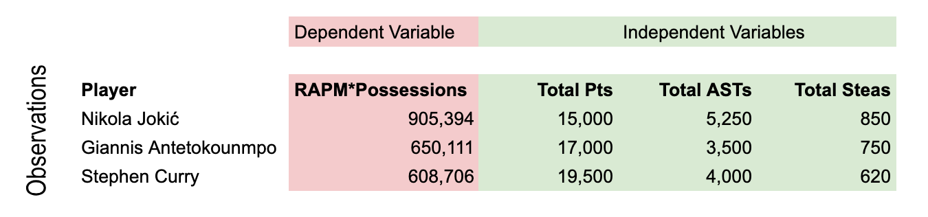 The final regression setup then, consists of RAPM*possessions as the new dependent variable, and the players' total stats as independent variables:
